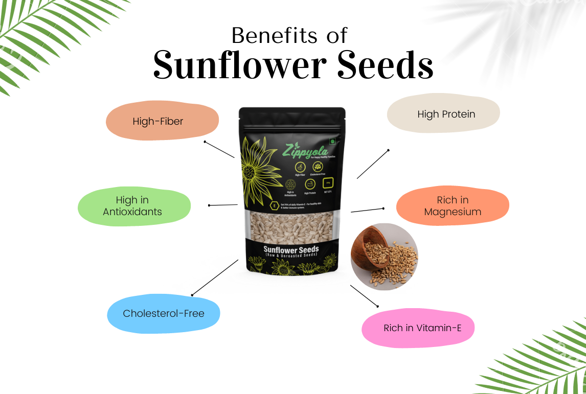 Low in Calories, High in Nutrients: Compared to other nuts, sunflower seeds are lower in calories (only about 40 calories per 2/3 cup) and high in nutrients. A good source of zinc, selenium, thiamine, phosphorus, magnesium, and manganese. Also high in phytosterols, which have been shown to have cholesterol-lowering properties. Lose Weight While You Snack on Zippyola Sunflower Seeds.